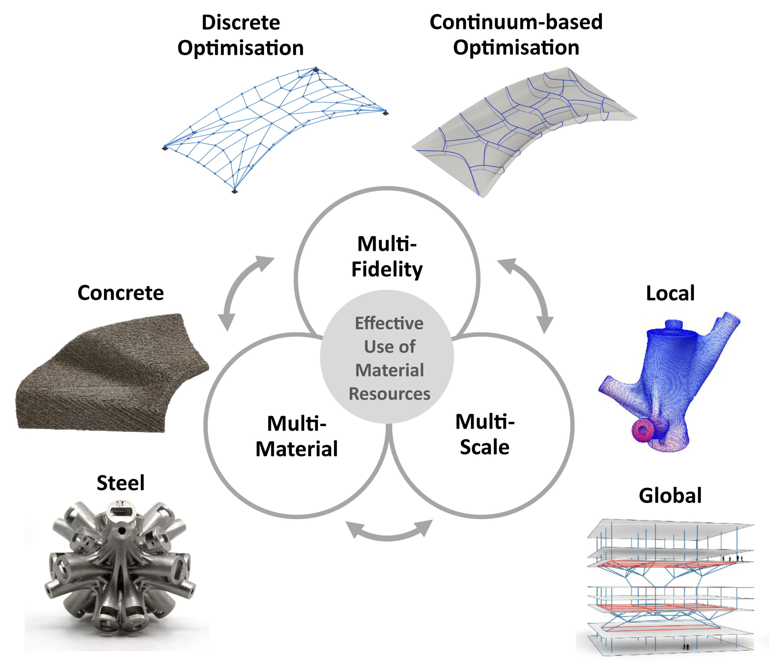 - Multi-scale: concurrent design of optimal structural forms (global scale) and segmentation into structural components (local scale).