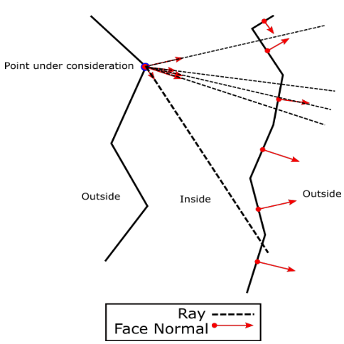 The first geometric boundary condition that was implemented was the minimum wall thickness of the geometry. This is because the geometry should not be thinner than the width of the weld seam at any point. These boundary conditions depend exclusively on the surface mesh of the geometry. The minimum thickness is controlled by the distance between opposing faces. (Fig. 2) Only with a consistent alignment of all normal vectors of the surface of the mesh was it possible to implement this boundary condition.