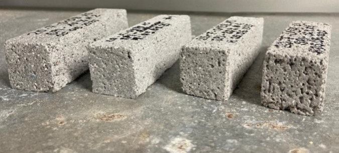 Figure 2: Specimen printed with fine fractioned recycled aggregates as SCM. From left to right: 10 % FFRA, Reference (without FFRA), 20 % FFRA, and 30 % FFRA / credit: Alexander Straßer