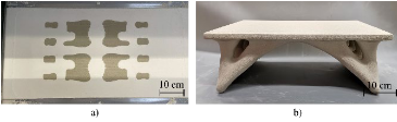 A small-scale bridge-like demonstrator, shown in Figure 1, was manufactured based on the design of the C02 project. Here, we explored the potential of printing shape- and topology-optimised geometries. The element was scanned using a laser scanner. Afterwards, the resulting point cloud was compared with the digital model of the slab, showing a mean deviation of 1.92 mm from the digital model, as shown in Figure 2. This was attributed to the capillary transportation effects of the water in the particle bed, resulting in the water flowing out of the designated area into the surrounding particle bed. The deviations on the bottom side were larger than those on the top side. Around the supports, occasional deviations of up to 7 mm were measured.