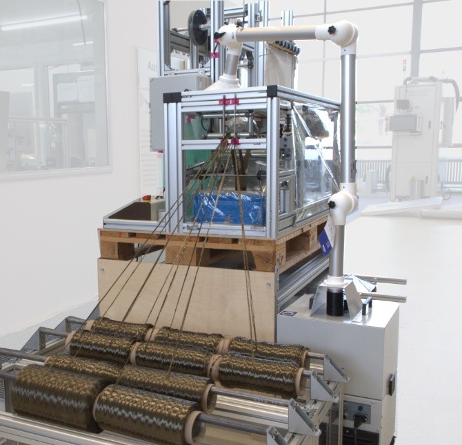 The individual integration of fibre reinforcement into large additively manufactured concrete components allows new design freedom and reduces concrete consumption due to reduced concrete cover. Strategies for the integration of freely formable reinforcing strands for different AM processes are being developed in project A05. A Dynamic Winding Machine is used to prepare reinforcement strands. This machine is used to consolidate and impregnate a primary fibre strand and wind a secondary yarn around it as a surface structuring. Thus, these reinforcement strands can be adapted for different purposes and enable more efficient production of highly customised, reinforced concrete elements.