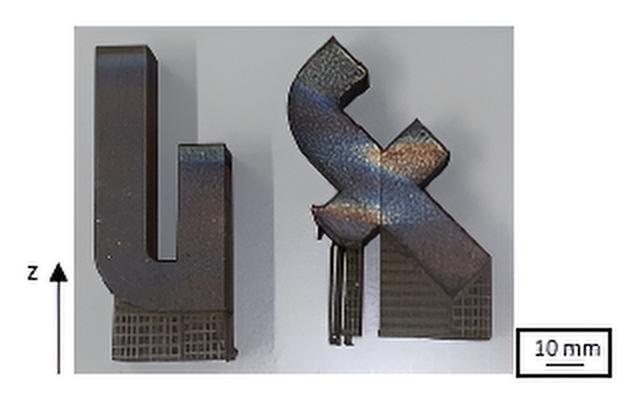 The manufacturing process with an argon atmosphere showed less contamination of the build chamber and filter, as can be seen in Fig. 1 b). There was almost no spatter, and minimal soot adhesion in the build chamber. In contrast to the cube specimens, the printed hollow parts (see Fig. 2) exhibited significant discolouration in the areas of overhangs and corners. The temper colours indicate overheating and surface oxidation, potentially caused by suboptimal process parameters in the overhang areas. Insufficient interlayer waiting time promotes the formation of thick oxide layers on the surface of each deposited layer. As shown in the literature, the oxide layer reduces the corrosion resistance of the part [1]. Further investigations regarding the influence of the interlayer waiting time on the printing of geometries with different overhangs and thicknesses should be conducted for Printdur HSA®.
