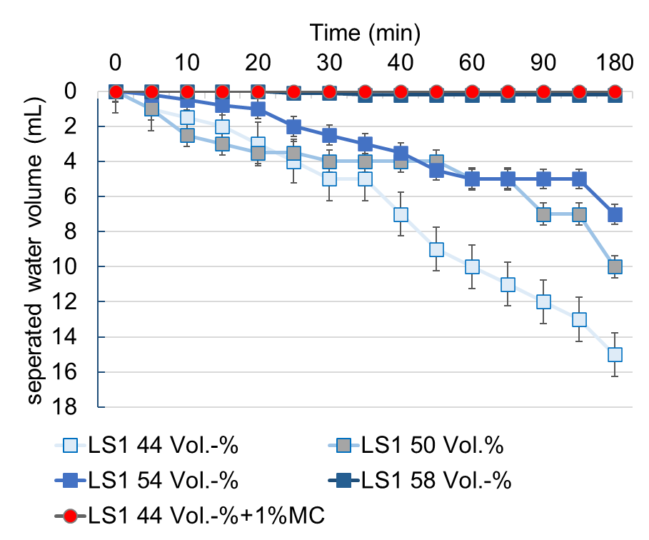 Currently, limestone powder suspensions varying in solid volume fraction and methyl cellulose (MC) content are investigated regarding yield stress (not shown here in detail) and sedimentation stability, Fig. 2. As expected, it is found that an increase in solid volume fraction in the limestone powder suspension (LS) from 44% to 58% is accompanied by a decrease in separated water volume, i.e. a decrease in sedimentation. For 58% even no sedimentation is observed within 180 minutes. The same behavior is observed when methyl cellulose is added to suspensions with lower solid volume fraction. Already for a suspension with 44% solid volume fraction with 1% of methyl cellulose, no sedimentation is occurring. For now it is concluded that for longer hardening times of the injected material it is favorable to choose a carrier liquid which does not sediment. Therefore, either high solid volume fractions of the suspension or the addition of additives are favorable.