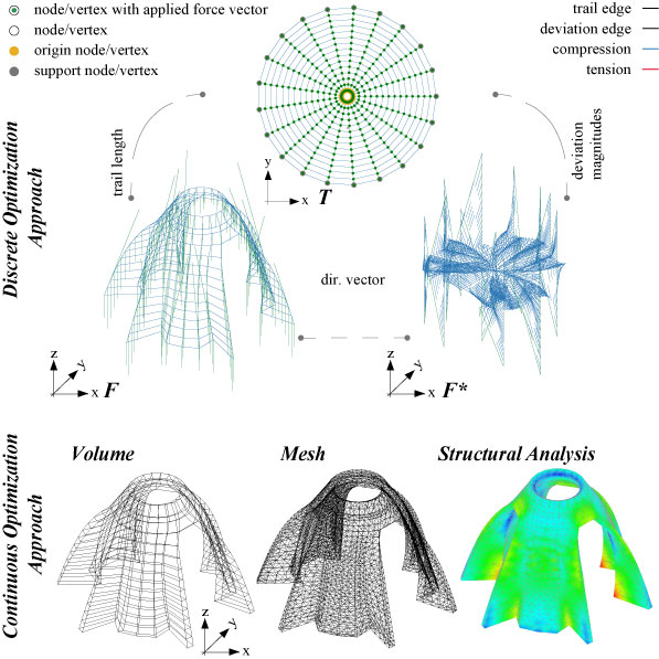 A major milestone has been achieved as the two core approaches, the Discrete Optimization Approach (DOA) and the Continuum-based Optimization Approach (COA), are now seamlessly linked within a unified workflow (Fig. 1). This connection allows low-fidelity design models developed with the DOA to be evaluated with a detailed, high-resolution analysis model. Selected solutions can then further be iterated in the COA with FEM-based Structural Optimization techniques.